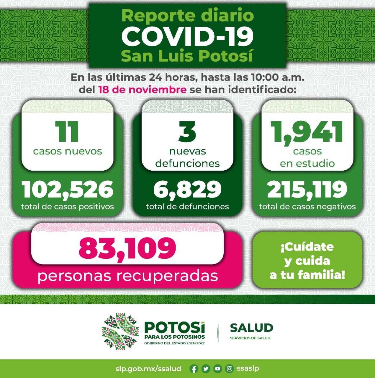 Los Servicios de Salud y el Comité Estatal para la Seguridad en Salud, informan que, hasta este jueves 18 de noviembre se registran 102 mil 526 casos totales de Covid-19, con la confirmación de 11 nuevos contagios de acuerdo al reporte epidemiológico de las últimas 24 horas.