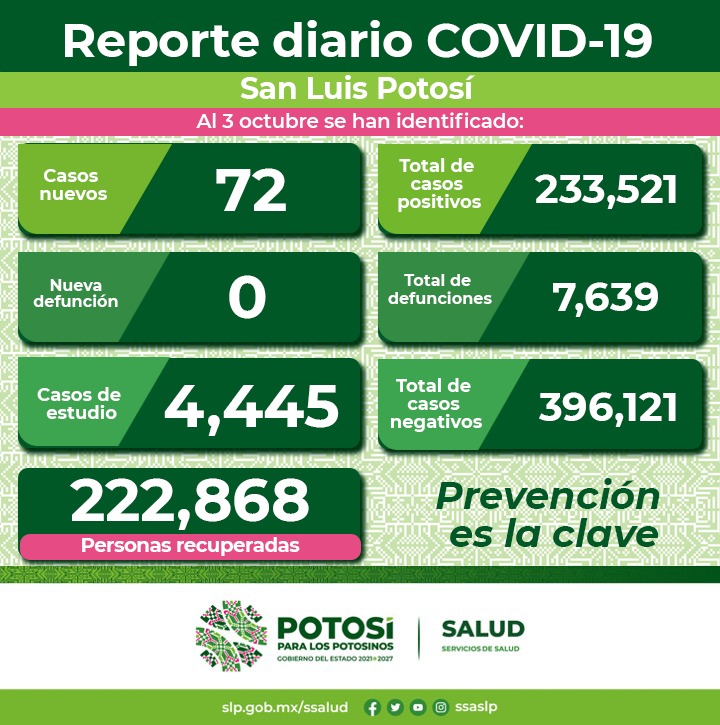 El Comité Estatal para la Seguridad en Salud y los Servicios de Salud informan que se han confirmado 72 nuevos contagios de Covid-19 en la entidad. Registrándose 233 mil 521 casos totales de este padecimiento.