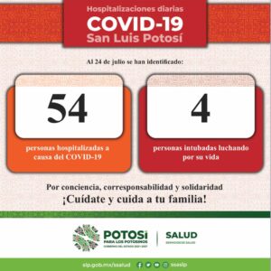 La mayor parte de las hospitalizaciones por Covid-19 se ubican en la zona metropolitana, y luego Ciudad Valles, seguido de Rioverde y Matehuala; quienes requieren de respiración asistida se encuentran en la zona metropolitana y Matehuala; en el marco del Día Internacional del Autocuidado de la Salud, los Servicios de Salud reiteran el llamado a potosinas y potosinos para que asuman una cultura de autocuidado, que sigan usando cubrebocas, lavando sus manos, practicando el estornudo de etiqueta, guardar sana distancia, ventilar espacios y sobre todo, evitar aglomeraciones.