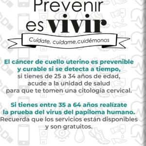 En nuestro país, el cáncer cervicouterino es la segunda causa de muerte por cáncer en la mujer, y el promedio de las defunciones en México se debe a que las mujeres no se realizan una detección por citología cervical (Papanicolaou) de manera oportuna. En esta semana se intensifican acciones y se invita a las mujeres entre 25 y 64 años de edad, a que acudan a recibir una adecuada orientación a su unidad de salud más cercana, las pruebas son gratuitas en cualquier momento del año.