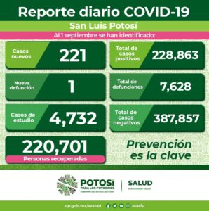 En San Luis Potosí se inicia el mes de septiembre con 1 mil 266 casos activos de Covid-19, 4 mil 499 menos casos que los registrados al iniciar agosto y una ocupación hospitalaria del dos por ciento en camas generales y de uno por ciento con ventilador, y se mantiene la tendencia nacional a la baja en los contagios por el virus.