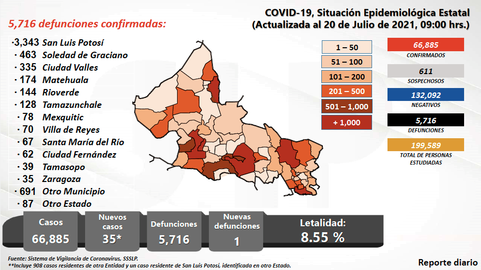 San Luis Potosí acumula hasta este miércoles 66 mil 885 casos, tras confirmarse 35 nuevos contagios en la últimas jornada, de los que 28 tienen residencia en la capital del estado, 2 en Soledad de Graciano Sánchez, 2 en Villa Hidalgo, 3 en Ciudad Valles, con un rango de edad de 3 a 87 años de edad.
