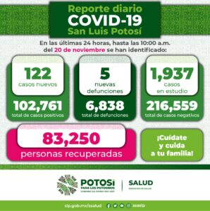 Los Servicios de Salud y el Comité Estatal para la Seguridad en Salud, informan que, hasta este sábado 20 de noviembre se registran 102 mil 761 casos totales de Covid-19, con la confirmación de 122 nuevos contagios de acuerdo al reporte epidemiológico de las últimas 24 horas.