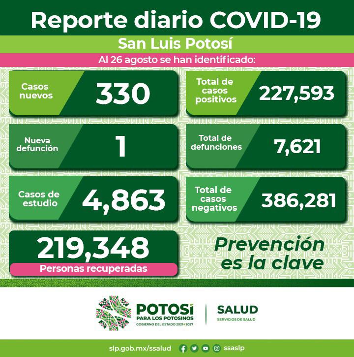 Se registran en San Luis Potosí 330 nuevos contagios de Covid-19, sumando hasta este 26 de agosto un total de 227 mil 593 casos; la cifra de muertes es de 7 mil 621 al reportar el Comité Estatal para la Seguridad en Salud y los Servicios de Salud una nueva defunción.