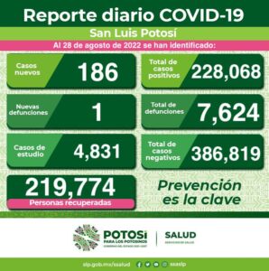 La cifra total de muertes en la entidad es de 7 mil 624 al ocurrir un nuevo deceso. Esta defunción corresponde a un hombre de 87 años de edad, entre los factores de riesgo se encuentran tabaquismo, enfermedad del corazón y la edad, no contaba con antecedente de vacunación contra Covid-19. Sobre los estudios de nuevos casos, 106 son mujeres y 80 hombres en un rango de edad de 3 meses a 88 años. Hay hospitalizadas 16 personas, de las que ninguna requiere respiración asistida.
