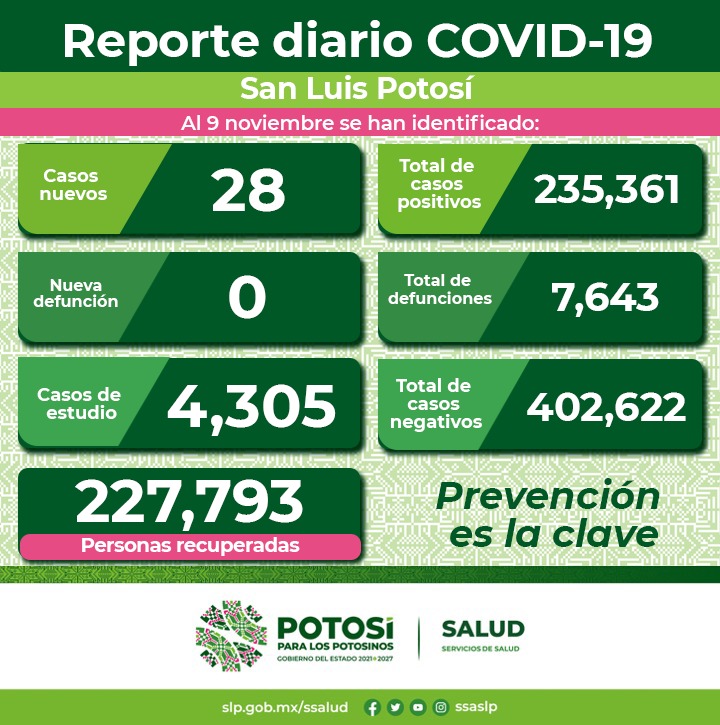 28 nuevos casos detectados en la Jurisdicción Sanitaria I,  26 en la capital y dos, en Soledad de Graciano Sánchez;  no se presentaron casos nuevos en personas residentes de otra entidad, así como en las siguientes jurisdicciones sanitarias, II de Matehuala, III de Villa de Pozos, VI de Rioverde, V de Ciudad Valles, VI de Tamazunchale y VII de Tancanhuitz.