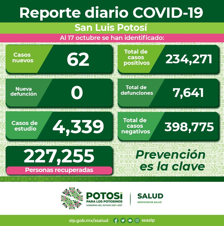 La cifra de muertes en el Estado se mantiene en 7 mil 641, al no registrarse nuevas defunciones; sobre los estudios de nuevos casos, 40 son mujeres y 22 hombres en un rango de edad de 18 a 86 años. Dos personas se encuentran hospitalizadas, de las cuales ninguna requiere de respiración asistida.