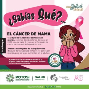En Octubre, Mes de la Sensibilización sobre el Cáncer de Mama, los Servicios de Salud de Gobierno del Estado intensifican actividades dentro de las unidades de mastografía, realizarán eventos públicos, así como también se transmitirá una potencia en vivo a través de la página de Facebook de los Servicios de Salud de San Luis Potosí (Facebook ssa/slp) con el tema: “La importancia de la detección oportuna en cáncer de mama”.