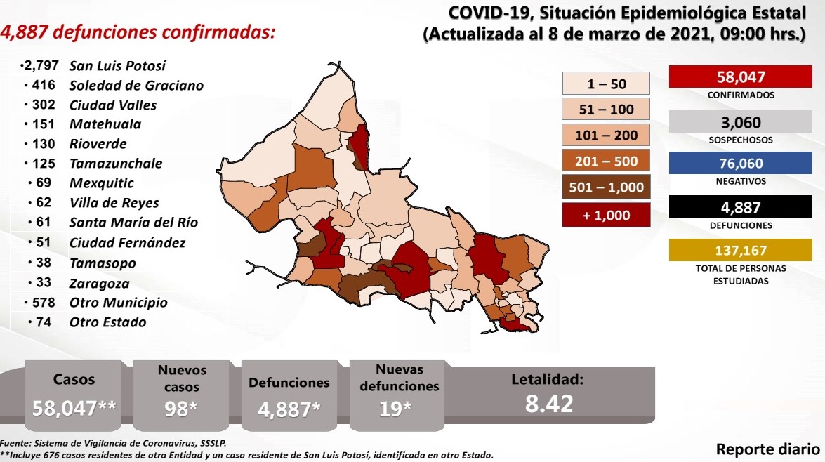 En el informe técnico se detalló que este 9 de marzo la cifra bajó al presentarse 98 nuevos casos que totalizan 58 mil 047 confirmados de 137 mil 167 personas estudiadas, de las que se han descartado 76 mil 060; la cifra de pendientes de estudio es de 3 mil 060 sospechosos, y el número de decesos subió a 4 mil 887 con un índice de letalidad del 8.42% por cada 100 casos.