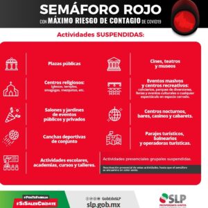 El titular de los Servicios de Salud del Estado, Miguel Ángel Lutzow Steiner, recordó que  debido a la contingencia sanitaria y el cambio del Semáforo epidemiológico en San Luis Potosí a color rojo de Máximo Riesgo de contagio, las medidas de protección para las y los ciudadanos comenzarán a aplicarse a partir de este 25 de enero, con el fin de reducir la movilidad social y los contagios.