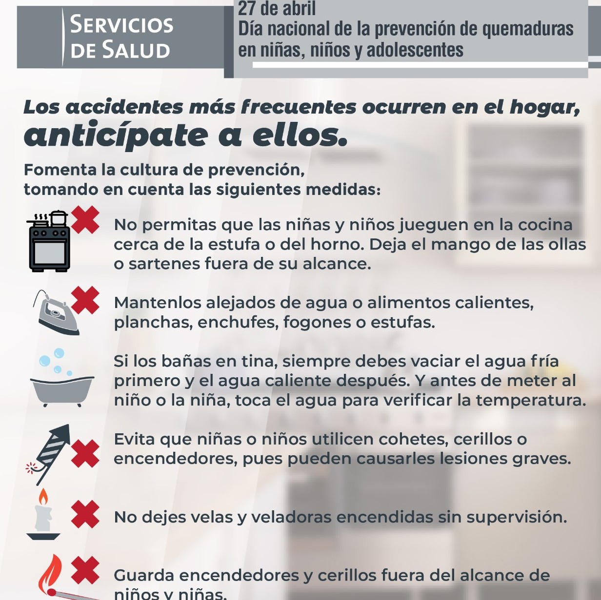 Con el propósito de impulsar y reforzar la cultura de la prevención, cada 27 de abril a nivel nacional se hace un llamado social a que niñas, niños y adolescentes, así como sus madres, padres, cuidadores y maestros, tomen conciencia de que las quemaduras son una de las principales causas accidentales de enfermedad y mortalidad en la infancia, siendo las térmicas por contacto con líquido caliente las más frecuentes.