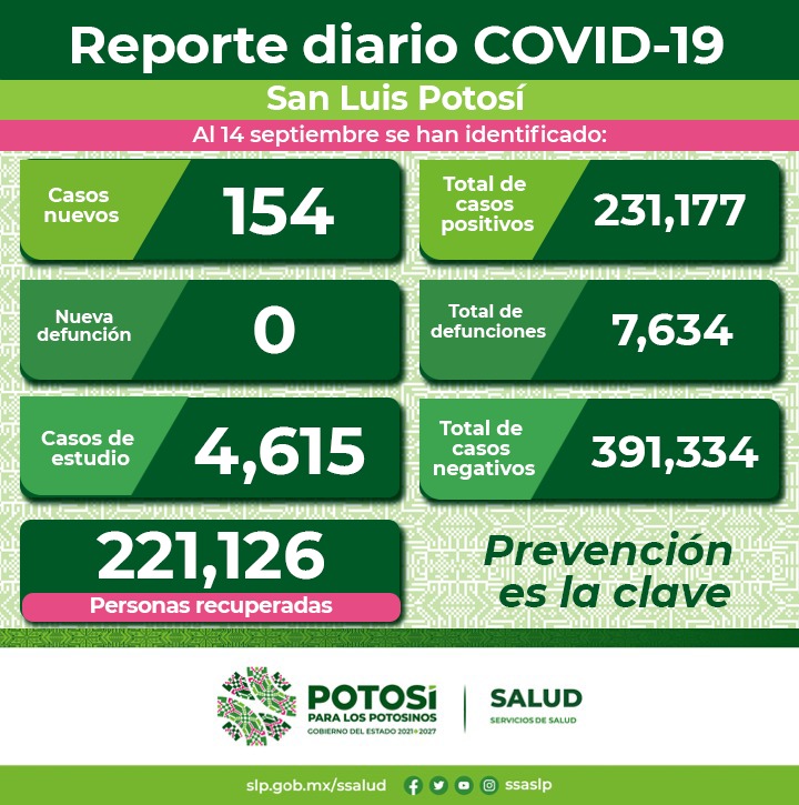 Para este 14 de septiembre, el Comité Estatal para la Seguridad en Salud y los Servicios de Salud informan que se han confirmado 154 nuevos contagios de Covid-19 en la entidad. De esta forma, se registran 231 mil 177 casos totales de este padecimiento.
