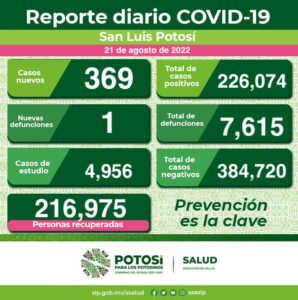 En el Estado, se han confirmado 369 nuevos contagios de Covid-19, sumando hasta este 21 de agosto 226 mil 074 casos totales del virus, por lo que el Comité Estatal para la Seguridad en Salud y los Servicios de Salud reiteran a la ciudadanía seguir aplicando las medidas de prevención.
