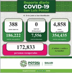 El Comité Estatal para la Seguridad en Salud y los Servicios de Salud informan que, este 26 de junio, se registran 388 nuevos contagios confirmados, y la cantidad de casos totales de Covid-19 en el Estado es de 186 mil 222, no se registran nuevas defunciones, por lo que la cifra de muertes en la entidad se mantiene en 7 mil 556.