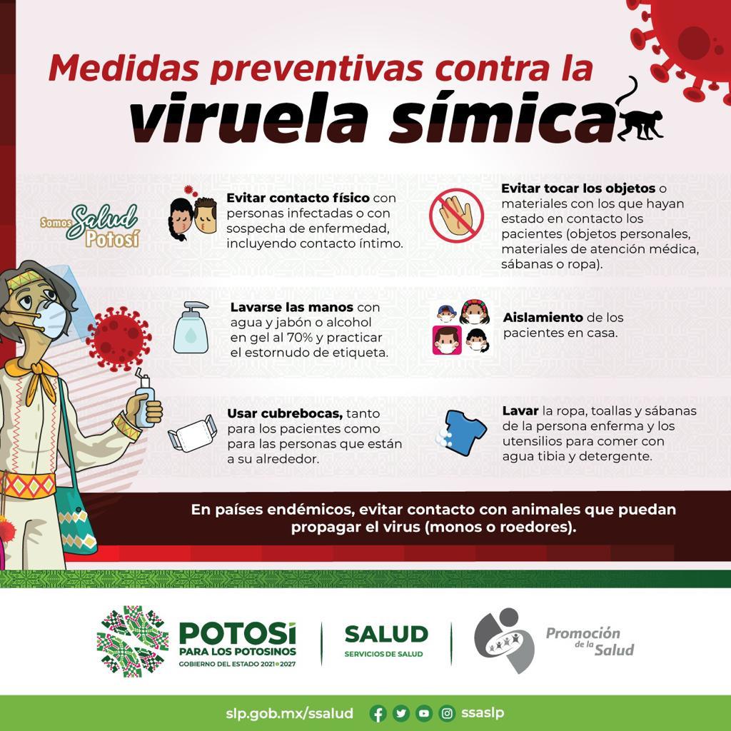 En San Luis Potosí, hasta este 7 de septiembre, de acuerdo a los protocolos establecidos en los que participan las diferentes instituciones estatales y federales de salud y atendiendo la instrucción del Gobernador del Estado, Ricardo Gallardo Cardona, nueve personas han requerido toma de muestra por sospecha de viruela símica que ha sido enviadas al Instituto de Diagnóstico y Referencia Epidemiológicos Dr. Manuel Martínez Báez (InDRE), de las cuales, solo un paciente fue confirmado y sin complicaciones.