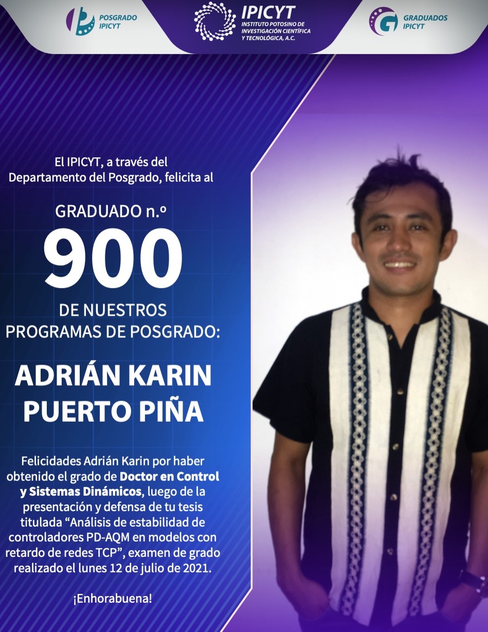 Con el examen de grado de Adrián Karín Puerto Piña el pasado 13 de julio, quien obtuvo el título de Doctor en Control y Sistemas Dinámicos, el Instituto Potosino de Investigación Científica y Tecnológica, A.C. (IPICYT), llegó a la cifra de 900 Graduados de sus Programas de Posgrados, rubro en el que sigue consolidándose como una institución formadora de recursos humanos de calidad, como lo requiere el país para resolver problemáticas nacionales.