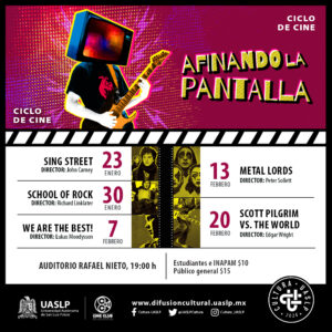 La coordinadora del Cine Club de la UASLP, Lic. Martha Márquez, dio a conocer que las películas: Sing Street, School of the rock, Metal lords, Scott Pilgrim vs The world, We are the best!, formarán parte del ciclo de cine “Afinando la pantalla”.