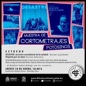 El total de estos cortometrajes fueron realizados por la Casa Productora Un Cuarto Studios, conformado por directores y realizadores cinematográficos. La muestra está compuesta por siete producciones, y se incluyen dos estrenos, “Réquiem por un amor”, y “Desastre, un breve recordatorio de la soledad”, de los directores potosinos: Emilio Sierra y Juan José DomPer.