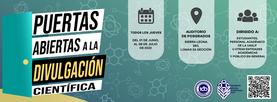 Con la finalidad de apoyar la divulgación del conocimiento, el Instituto de Metalurgia de la Universidad Autónoma de San Luis Potosí, realizará todos los jueves del 01 de junio al 06 de julio de 2023, el curso “Puertas Abiertas a la Divulgación Científica”, dirigido a estudiantes, académicos, investigadores y público en general.