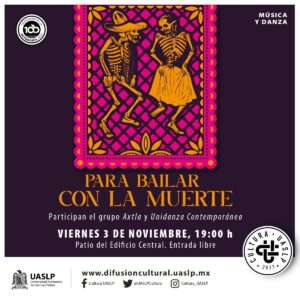 Posteriormente, a las 19:00 horas en el Patio del Edificio Central del mismo viernes 03 de noviembre, el Grupo Axtla y Unidanza Contemporánea, nos invitan al recital “Para bailar con la muerte, al son que me toques canto y danzo”; un espectáculo que fusiona la música y la danza y en donde podrán deleitarse con temas como Morir en Paz, El corrido de Macario el curandero, La calaca, El muerto se fue de rumba y Calaverita, entre otros muchos más.