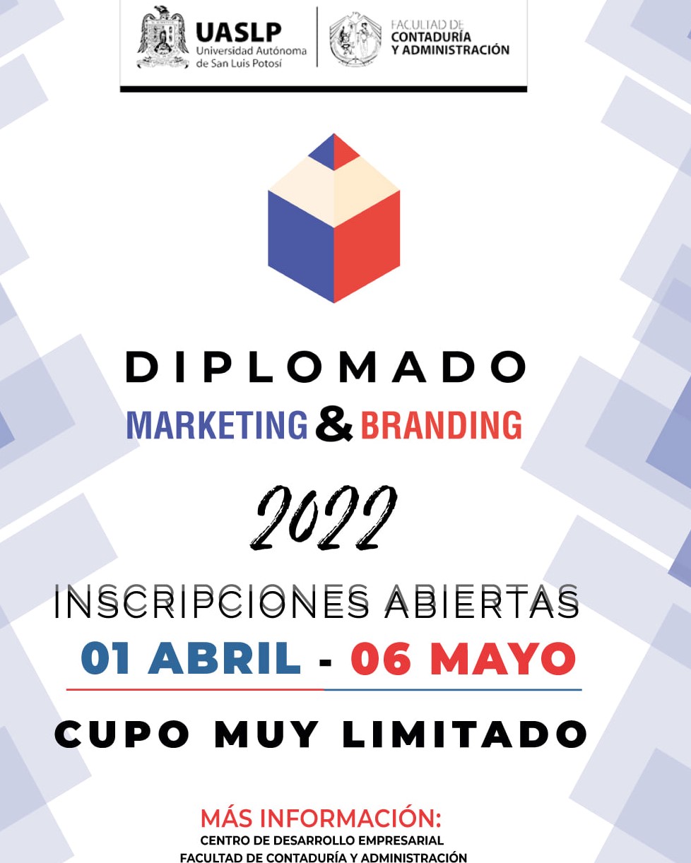 La Facultad de Contaduría y Administración (FCA) de la Universidad Autónoma de San Luis Potosí (UASLP) invita a la comunidad universitaria y al público en general a cursar el Diplomado Marketing & Branding, que realizará con modalidad presencial del 6 de mayo al 3 de septiembre de 2022.