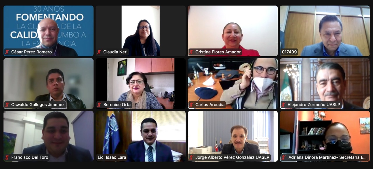La reunión virtual de visita de evaluadores reunió al Dr. José Alberto Gaytán García, Vocal Ejecutivo del Comité de Ciencias Sociales y Administrativas, y al Lic. César Pérez Romero, Asesor institucional de CIEES, Y de la UASLP, al Dr. Jorge Alberto Pérez González, secretario Académico; la Mtra. Maricela Ramírez Zacarías, directora de Evaluación y Prospectiva de la Secretaría Académica.