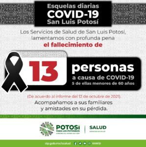 La Secretaría de Salud de San Luis Potosí y el Comité Estatal para la Seguridad en Salud, informan que, hasta este martes 12 de octubre se registran 99 mil 306 casos totales de Covid-19, con la confirmación de 155 nuevos contagios en las últimas 24 horas.